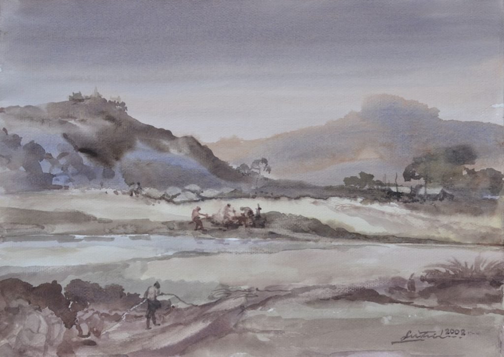 ဒီလိုနဲ့ ဆရာ ရန်ကုန်ရောက်ရင် တွေ့ဖြစ်လိုက်၊ မတွေ့ဖြစ်လိုက်နဲ့ ၁၉၉၅မှာ ဆရာဦးဉာဏ်ရှိန်နဲ့ ကျွန်တော် ရင်းနှီးမှန်း သိတော့ဆရာ လူကြုံစကား ပါးပါတယ်။ ပစ္စည်းလေးတွေလည်း ပို့ပေးရပါတယ်။ သေသေ သပ်သပ်ထုပ်ပိုးထားတဲ့ အထုပ်သေးသေးလေးတွေပါဘဲ။ ဆရာဒီနေ့ ပေးလိုက်ရင် နောက်နေ့ဆရာ ဦးဉာဏ်ရှိန်ဆီ သွားပို့လိုက်တာပါဘဲ။ ဆရာဦးလူတင်နဲ့ဆရာဦးဉာဏ်ရှိန်တို့ဟာ ပန်းချီမိတ်ဆွေများ ဖြစ်ကြသလို ဓမ္မမိတ်ဆွေ တွေလည်းဖြစ်ကြပါတယ်။ တစ်ခါ ဆရာပန်းချီကျောင်း ရောက်နေသည် ဆို၍ ကျွန်တော်ရယ် သော်ဇက်ရယ် ကောင်းစုရယ် ရန်ကုန် ပန်းချီကျောင်း ဆရာရှိတဲ့ဆီကို ရောက်သွားခဲ့ကြပါတယ်။ ရောက်တော့ ဆရာက သူရဲ့ တစ်ကိုယ်တော်ပြပွဲ ဂျာမနီမှာ ပြသနေတယ်ဆိုတဲ့ အကြောင်းပန်းချီ နဲ့ အနုရသ အထွေထွေ အကြောင်းပြောရင်း 11″x15″ ဆိုဒ်ရှိ ရေဆေးစက္ကူနှစ်ရွက်ကို တပိုင်းစီ ပိုင်းပြီး ရေဆေးကို စရေးပါတော့တယ်။ ဆရာရဲ့ ရေဆေးခွက်ထဲက အရောင်တွေဟာ ဘယ်ဟာက အဝါ၊ ဘယ်ဟာက အစိမ်း၊ ဘယ်ဟာက အပြာမှန်း မသိအောင်ကိုဘဲ ရှိနေပါတယ်။ ဒါ အရောင်အစစ်တွေကို ငြီးငွေ့သွားတာ ဖြစ်မယ်လို့ထင်ပါတယ်။ စကားပြောလိုက် ရေးလိုက်နဲ့ တစ်ကားပြီး တစ်ကား ရေးသွားလိုက်တာ အားလုံးလေးကား ပြီးသွားပါတယ်။