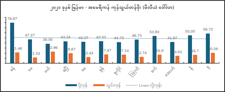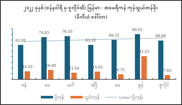 အမေရိကန် ကုန်သည်ရေးရာ အေဂျင်စီရဲ့ အဆိုအရ ပြီးခဲ့တဲ့နှစ် (၂၀၂၄ ခုနှစ်) က နှစ်နိုင်ငံ ကုန်သွယ်ရေး ဒေါ်လာ ၇၃၄ သန်း ရှိခဲ့ကြောင်း၊ ဒီအထဲမှာ မြန်မာနိုင်ငံက ပို့ကုန်တန်ဖိုးက ဒေါ်လာ ၆၅၆.၅ သန်း ရှိခဲ့သလို အရင်နှစ် (၂၀၂၃ ခုနှစ်) ကထက် ၂၃.၅ ရာခိုင်နှုန်း လျော့နည်း သွားတယ်လို့ ဆိုပါတယ်။