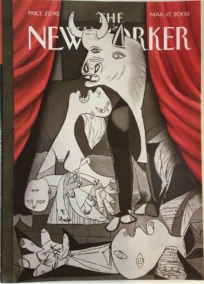 ကောလင်းပါဝဲလ်ဖြစ်စေ၊ အခြားအမေရိကန်သံတမန်တစ်ဦးဦးဖြစ်စေ သတင်းထောက်များအား အီရတ်စစ်ပွဲ ဆင်နွှဲဖို့ကိစ္စကို ရှင်းလင်းပြောကြားရာ၌ စစ်ဆန့်ကျင်ရေးသရုပ်ပြ ဂါးနီးကား ပန်းချီကား ကြီးကို နောက်ခံထား၍ ပြောလိုဟန်မတူဟု သုံးသပ်ကြသည်။ နောက်ကျောမလုံတာ ဖြစ်မည်။ နယူးယောက်ကာ မဂ္ဂဇင်းအယ်ဒီတာက မတ်လ ၁၇ ရက်နေ့ထုတ် မဂ္ဂဇင်းတွင် ဂါးနီးကားပန်းချီကို မျက်နှာဖုံးတင်သည်။ သူတို့က ရိုးရိုးမတင်၊ ပန်းချီကားကြီးအပေါ် ကန့်လန့်ကာ ကျလာပုံ ဒီဇိုင်းထုတ်ပြီး တင်တာ။ ကန့်လန့်ကာအရောင်က အနီရင့်ရင့်။ ကောလင်းပါဝဲလ်တို့အဖွဲ့ကို ညွှန်းတာလည်း ပါမည်။ စစ်/စစ်ပွဲက စစ်ဆန့်ကျင်ရေးအပေါ် အနိုင်စီးသွားပုံကို ညွှန်းတာဖြစ်မည်။ ဒီဇိုင်းဆရာက ဟယ်ရီ ဘလစ်စ်။