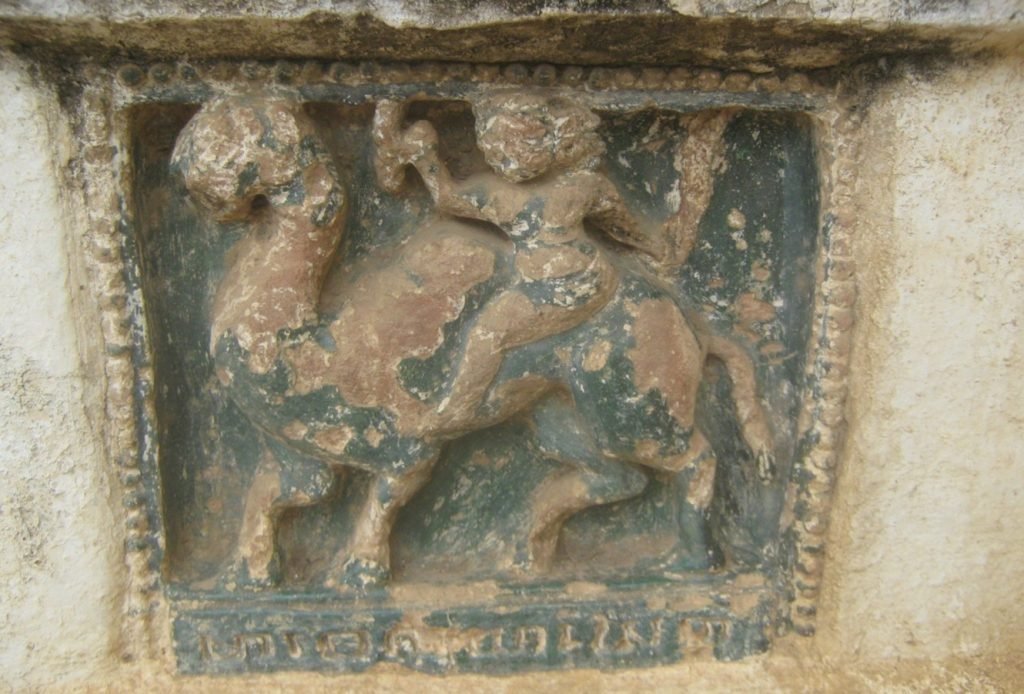 စဉ့်ကွင်းများအားလုံး၏ အောက်ခြေတွင် ပါဠိဘာသာ၊ အေဒီ(၁၁)ရာစုမွန် အက္ခရာဖြင့် ဇာတ်ကွက် သရုပ်ဖော်ပုံအား ကမ္ပည်း ရေးထိုး ထားသည်။ စဉ့်ကွင်းများအားလုံကို မြေမီးဖုတ် စဉ့်စိမ်းသုတ် ထားသည်။
