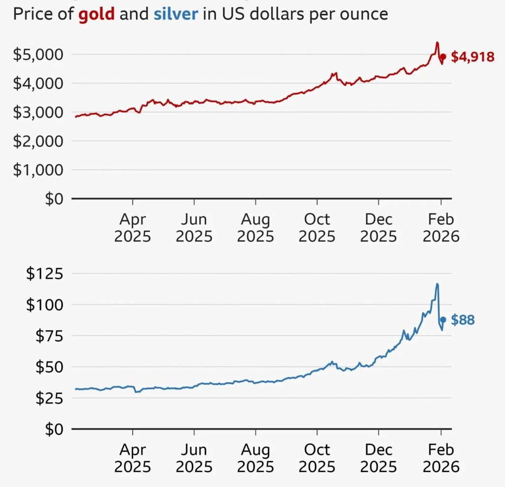 မကြာခင် လများအတွင်း ရွှေနှင့် ငွေဈေးကွက်တို့သည် အတော်အတန် လှုပ်ခတ်မှုများရှိခဲ့သည်။ ၂၀၂၅ ခုနှစ်အတွင်း အဆိုပါ အဖိုးတန် သတ္တု နှစ်မျိုးစလုံး၏ ဈေးနှုန်းများသည် တည်ငြိမ်ပြီး အားကောင်းသော အနေအထားဖြင့် တစ်စတစ်စ မြင့်တက်ခဲ့သော်လည်း ယခုနှစ်အစတွင်မူ မယုံကြည် နိုင်လောက်အောင် အရှိန်အဟုန်ဖြင့် ထိုးတက်သွားခဲ့သည်။ ရွှေဈေးနှုန်းသည် ဇန်နဝါရီလအတွင်း ၂၅ ရာခိုင်နှုန်းကျော် မြင့်တက်ခဲ့ပြီး တစ်အောင်စလျှင် ဒေါ်လာ ၅,၅၀၀ အထက်သို့ ရောက်ရှိကာ ယခင်စံချိန်တင်ဈေးနှုန်းများအားလုံးကို ကျော်လွန်သွားခဲ့သည်။ “အားမြှင့်ထားသော ရွှေ” (Gold on steroids) ဟု တင်စားကြသည့် ငွေဈေးနှုန်းသည်လည်း ၂၀၂၅ ခုနှစ်ကို ၇၀ ဒေါ်လာဖြင့် အဆုံးသတ်ခဲ့ပြီး ၂၀၂၆ ခုနှစ် စောစောပိုင်းတွင် ၆၀ ရာခိုင်နှုန်းခန့် ထပ်မံမြင့်တက်ကာ တစ်အောင်စလျှင် ၁၂၀ ဒေါ်လာအထိ မယုံကြည်နိုင်ဖွယ် ကောင်းလောက်သော ဈေးနှုန်းသို့ ရောက်ရှိခဲ့သည်။