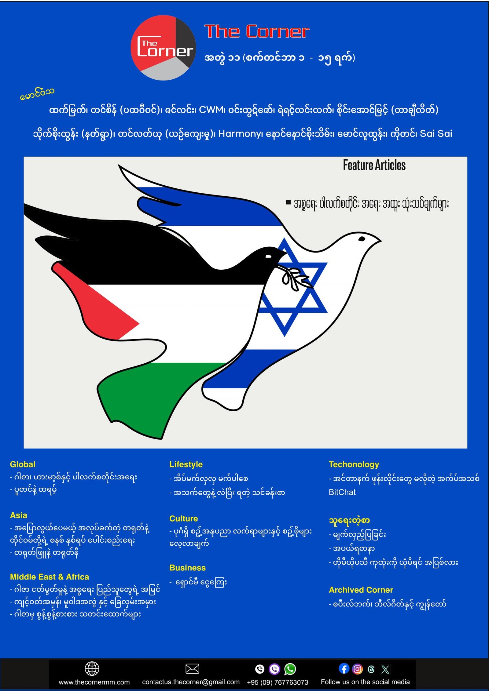 The Corner အတွဲ (၁၁) မှာ အရှေ့အလယ်ပိုင်းမှာ ဖြစ်ပွားနေတဲ့ ပါလက်စတိုင်း – ဟားမာ့စ်နဲ့ အစ္စရေးတို့ တင်းမာနေမှု သုံးသပ်ချက်များကို ဒေါင့်စုံက ပြည့်ပြည့်စုံစုံ တင်ပြထားပါတယ်။ ယနေ့ ကမ္ဘာပေါ်မှာ ဖြစ်ပျက်နေတာတွေ များတဲ့အခါ ပရိသတ်များ သိလိုမယ်ထင်တဲ့ အကြောင်းအရာ ခေါင်းစဥ်များကို သေသေချာချာ စဥ်းစား စီစဥ် တင်ဆက်လိုက်ခြင်းပါ။ အခြား ဖြစ်ပေါ်နေတဲ့ ကိစ္စများဟာလည်း အရေးမကြီးလို့ မဟုတ်။ သို့သော် ဆိုရှယ် မီဒီယာခေတ်မှာ အခုဖြစ် အခုသိ နောက်အသစ်ဖြစ် ရှေ့ကဟာကို မေ့လိုက် သံသရာမှာ လည်ပတ်နေကျ မို့လို့ ထဲထဲဝင်ဝင် သိအောင် အကြောင်းအရာ ခေါင်းစဥ်တစ်မျိုးကို သီးသန့် ထုတ်နုတ် တင်ပြတာလို့ ပြောမယ်ဆိုရင်လည်း ရပါတယ်။