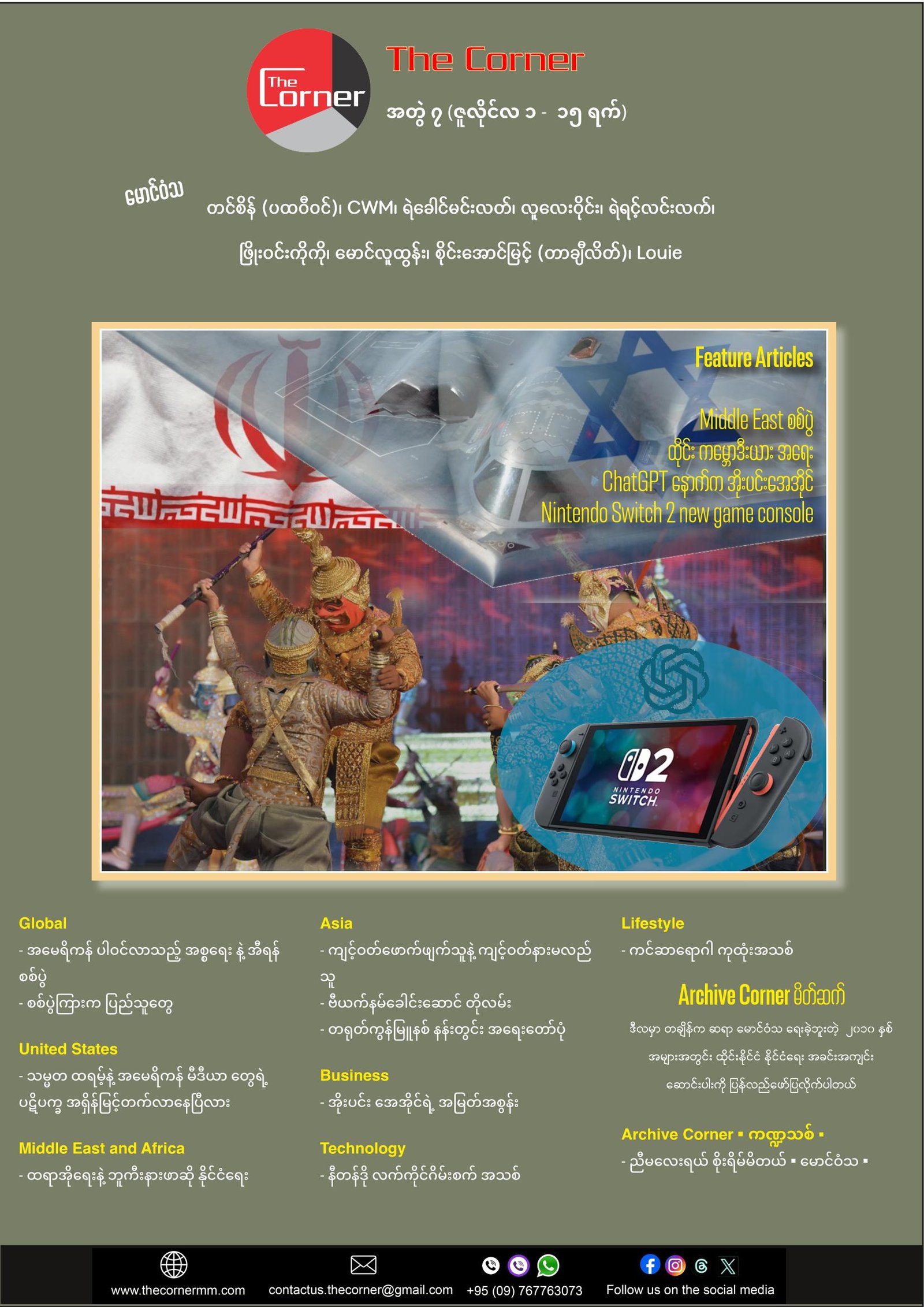 အတွဲ (၆) ထွက်ပြီး သိပ်မကြာပါဘူး၊ အရှေ့အလည်ပိုင်း ဒေသမှာ အစ္စရေး နိုင်ငံက အီရန်ကို နျူကလီးယား အကြောင်းပြ တိုက်ခိုက်ပါတယ်။ သိပ်မကြာခင်မှာပဲ အမေရိကန်ပါ ပါဝင်လာပြီး အခုတော့ နဲနဲ ပြန်ပြီး တည်ငြိမ်လာပါပြီ။ The Corner ကလဲ ဒီအရေးကိစ္စ သုံးသပ်ချက်ကို ဒီအတွဲမှာ ပါအောင် ထည့်ချင်တဲ့အခါ ဆောင်းပါးကို အဆုံးသတ်ရင်း အသစ်ဖြစ်ရပ်တွေက ပေါ်လာရင်းနဲ့ ဒီနေ့ စိတ်ကို ဒုံးဒုံးချရင်း နောက်ဆုံး ဖြစ်ရပ်တွေကို ရအောင် ထည့်ထားတဲ့ သုံးသပ်ချက် ဆောင်းပါးကို ထည့်ထားပါတယ်။