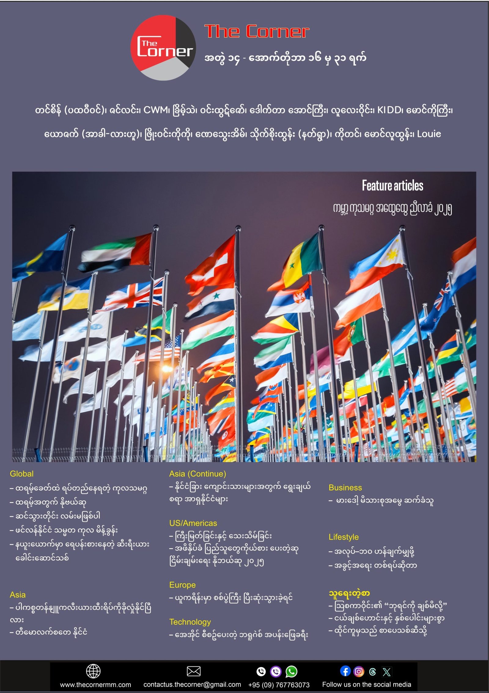 မသေချာတာ တွေထဲမှာ သေချာတာ တစ်ခုကတော့ ကျွန်တော်တို့ရဲ့ The Corner အတွဲ ၁၄ ထွက်လာ တာပါ။ ဒီအတွဲမှာ မကြာခင်က ကျင်းပပြီးစီးသွားတဲ့ ကမ္ဘာ့ကုလသမဂ္ဂ အထွေထွေ ညီလာခံကြီးနဲ့ ကုလ အဖွဲ့ကြီးရဲ့ လက်တလော ကြုံတွေ့နေရတဲ့ အခြေအနေများနဲ့ နိုင်ငံ့ ခေါင်းဆောင် များ ညီလာခံကြီးမှာ ပြောကြားသွားခဲ့တဲ့ မိန့်ခွန်းများထဲမှ ဖင်လန်နိုင်ငံသမ္မတရဲ့ မိန့်ခွန်း ဟာ ကမ္ဘာ့ လက်ရှိအခြေအနေ သုံးသပ်ချက်နဲ့ အဖွဲ့ကြီးအပေါ် ပိုမို ထိရောက်တဲ့ လုပ်ငန်းများကို လုပ်နိုင်အောင် အကြံပြုချက်များ ပါဝင်တဲ့ မိန့်ခွန်းတစ်ရပ် ဖြစ်လို့ The Corner မှာ သုံးသပ် တင်ပြထားပါတယ်။ The Corner ရဲ့ ထုံးစံ အတိုင်း အခြား စိတ်ဝင်စားစရာ အကြောင်းအရာ များကိုလည်း တတ်စွမ်းသရွေ့ စုစည်း တင်ဆက် ထားပါတယ်။