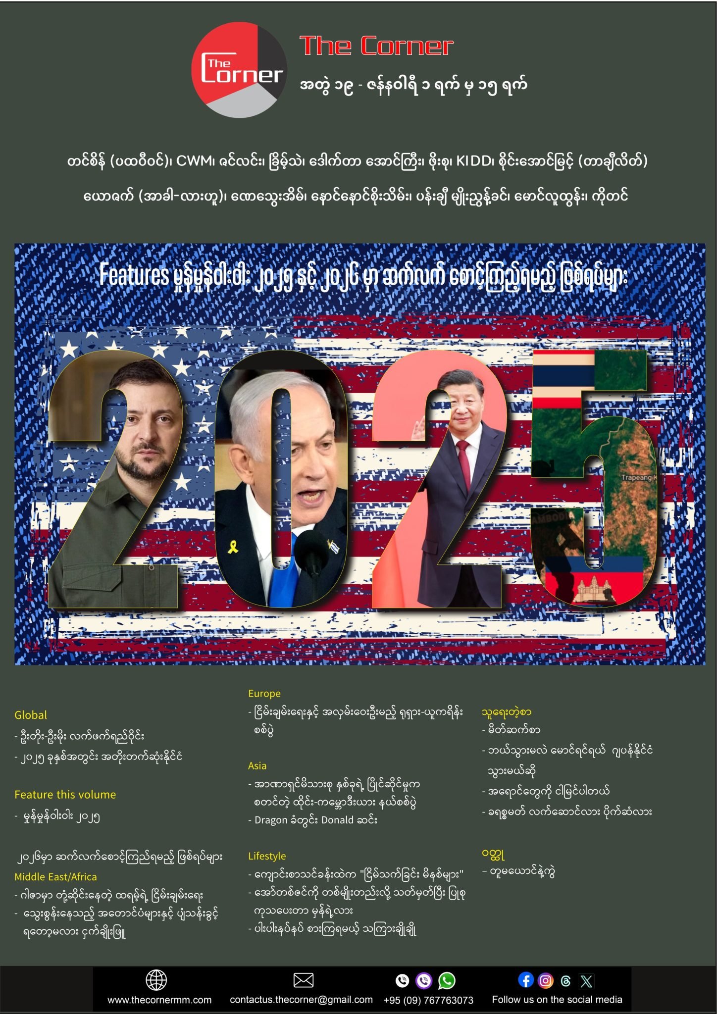 ၂၀၂၆ အတွက် ပွဲဦးထွက် အတွဲ (၁၉) မှာ ကျန်ခဲ့တဲ့ ၂၀၂၅ ခုနှစ်အတွင်း ထင်ရှားခဲ့တဲ့ ကမ္ဘာ့ဖြစ်ရပ် များကို စုစည်းတင်ဆက်ထားပြီး ၂၀၂၆ မှာ ဆက်လက်စောင့်ကြည့်ရမယ့် ကိစ္စရပ်များကို Feature လုပ် တင်ဆက်ထားပါတယ်။ The Corner စာတည်းအဖွဲ့က ၂၀၂၅ခုနှစ်ထဲ အထင်ကရ ဖြစ်ရပ်များထဲက ၂၀၂၆မှာ ဆက်လက်စောင့်ကြည့်ရမယ့် ဖြစ်ရပ်များအဖြစ် ၁) အရှေ့အလယ်ပိုင်းက ဂါဇာဒေသ တည်ငြိမ်ရေး၊ ၂) ပြီးမလိုလို မပြီးလိုလို ဖြစ်နေတဲ့ ရုရှား-ယူကရိန်းအရေး၊ ၃) အာရှရဲ့ အိမ်နီးချင်း ထိုင်းနိုင်ငံ နဲ့ ကမ္ဘောဒီးယားတို့ အပွန်းအတိုက်များ နဲ့ နောက်ဆုံး ၄) ကမ္ဘာ့စင်မြင့်ထက်မှာ နေရာပိုရလာတဲ့ တရုတ်နိုင်ငံ နိုင်ငံရဲ့ စီးပွားရေး နဲ့ နိုင်ငံရေး နယ်ပယ်ချဲ့ထွင်မှုနဲ့ တစ်ဖက် အမေရိကန်နဲ့ အားပြိုင်မှုတွေ ပဲဖြစ်ပါတယ်။ သုံးသပ်ချက် ဆောင်းပါးများကို တင်ပြထားပြီး ထူးခြားတဲ့ အသစ်တိုးတက်မှုများကို ဆက်လက် တင်ပြသွားမှာဖြစ်ပါတယ်။ ကျန်တဲ့ကဏ္ဍများကိုလည်း The Corner ရဲ့ထုံးစံအတိုင်း အရည်အသွေးအပြည့် တင်ဆက်ထားတာ မို့လို့ လွတ်သွားလို့ မဖြစ်ပါဘူး။ ဖတ်ဖြစ်အောင် ဖတ်ကြဖို့ တိုက်တွန်းပါရစေ။