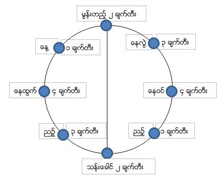 ကျွန်တော် အမှတ်တမဲ့ နေခဲ့တဲ့အကြောင်းအရာလေး မကြာခင်ကပြန်ဖတ်မိတော့စဉ်းစားစရာတစ်ခုဖြစ်ခဲ့တယ်။ အဲဒါက ဘာလဲဆိုတော့ မြန်မာမှာအချိန်သတ်မှတ်ပုံက နာရီ ၆၀ ရှိတယ်ဆိုတဲ့အကြောင်းပဲဖြစ်ပါတယ်။ မြန်မာ ရေနာရီပါ။ တစ်နေ့ကို နာရီ ၆၀ သတ်မှတ်ထားပါတယ်။ ကျွန်တော်တို့ လက်ရှိသုံးနေတဲ့နာရီက ၂၄ နာရီရှိ တယ်ဆိုတာ လူတိုင်း လက်ခံ ထားပြီးသား ဖြစ်သလို မြန်မာတွေ လူငယ်ဘ၀ စာစသင်ပြီဆိုကတည်းက ဒီ ၂၄ နာရီရှိ တဲ့နာရီကို ကြည့်တတ်ဖို့ သင်ကြားခဲ့ရတာပဲဖြစ်ပါတယ်။ တကယ်ဆို ကျွန်တော်တို့တစ်တွေက မြန်မာတွေ မဟုတ်ဘူးလား။ ဘာဖြစ်လို့ သူများနာရီကို ယူငင် သုံးစွဲခဲ့ရတာလဲ။ ဒီမေးခွန်းရဲ့ အဖြေကို ကျွန်တော် မသိပါဘူး။ ကျွန်တော့်အထင် လွယ်ကူ အဆင်ပြေတဲ့အရာ မို့လို့ သုံးစွဲခဲ့တယ်လို့ ထင်ပါတယ်။ ဒါကြောင့်လည်း ယနေ့ထိ လူတိုင်းရဲ့ လက်မှာ သူတို့ရဲ့ အချိန် သတ်မှတ်ပုံတွေကို တခုတ်တရ ဈေးကြီးပေးပြီး ဝယ်ယူ ပတ်နေ ရတာပေါ့။ ဒီလို တဖြည်းဖြည်းနဲ့ မြန်မာတို့ရဲ့ နာရီ (သို့) အချိန်သတ်မှတ်ပုံတွေဟာ လူတိုင်းရဲ့ ရင်ထဲမှာ မေ့ပျောက် ခံထားခဲ့ရတာ ကြာခဲ့ရပြီ။ အသုံးမဝင်သော အရာတစ်ခုအဖြစ် ချောင်ထိုးထား ခံနေရတာ ကြာပါပြီ။ ဒီနေရာမှာမေးစရာရှိတာက ဒီလိုအလွယ် တကူ အဆင်ပြေတဲ့အရာကို သုံးတယ်ဆိုတော့ ကျွန်တော်တို့ လူမျိုးတွေဟာ အလွယ်ကြိုက်တဲ့ လူမျိုးတွေလား။ ကိုယ်ပိုင် တီထွင်ဉာဏ် မရှိတဲ့ လူမျိုးတွေလား။ အဲဒီလို မေးခွန်းတွေ မေးကြည့်ချင်စရာ ကောင်းနေပေမယ့်လို့ ကိုယ့်ထက် အဆပေါင်း များစွာသော ဆရာတွေက အဆင်ပြေအောင် လုပ်ပေးခဲ့မှုအပေါ်မှာ တစ်စုံတစ်ရာ ကန့်ကွက်ချင်လို စိတ်မရှိတာကြောင့် ရှိမြဲ အတိုင်းပဲ ထားလိုက်ချင်ပါတယ်။