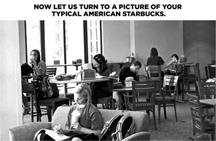 ခရိုအေးရှားကော်ဖီဆိုင်ထဲက စားပွဲတွေကိုကြည့်လိုက်ရင် စားပွဲတိုင်းလိုလိုမှာ လူတစ်ဦးထက်ပိုထိုင်နေတာတွေ့ရမည်။ ထိုင်နေသူ အားလုံးလိုလို သူတို့အချင်းချင်း စကားပြောနေတာ တွေ့ရမည်။ (ပုံထဲက ဘဲတစ်ပွေကတော့ တစ်ယောက်တည်း ထိုင်နေလေရဲ့။ သူ့တီရှပ်မှာ အမေရိကန်အလံနဲ့။ ဒါဆိုသဘောပေါက်။) လူတွေက ထိုင်နေရုံ သက်သက်၊ သူတို့စမတ်ဖုန်းတွေနဲ့ ဆော့နေရုံသက်သက် မဟုတ်ပေဘူးဗျ။ သူတို့က စကားပြောနေတာ။ အပြန်အလှန် ပြောနေကြတာ၊ သူငယ်ချင်းတွေ ဘော်ဒါတွေနဲ့ စုစုဝေးဝေးထိုင်နေကြတာ။ တစ်ဦးကို တစ်ဦး အဖော်သဟဲ ပြုနေကြတာ။